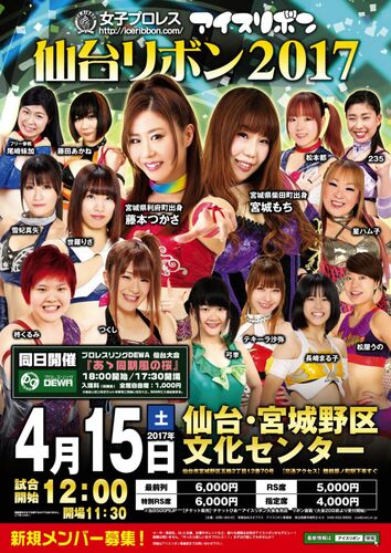 アイスリボン 「仙台リボン2017」 日時:2017年4月15日(土) 12:00 会場:宮城・仙台市宮城野区文化センター 観衆:224人(満員札止め) オープニング 第1試合 第2試合 第3試合 第4試合 セミファイナル メインイベント エンディング オープニング アイスリボン …