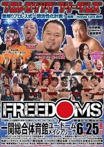 プロレスリングFREEDOMS 「里帰りプロレス式一関活性化計画2017」 日時:2017年6月25日(日)14:00 会場:岩手・一関市総合体育館ユードーム メインアリーナ 観衆:756人 第1試合 第2試合 第3試合 第4試合 セミファイナル メインイベント 第1試合 スペシャルオ…