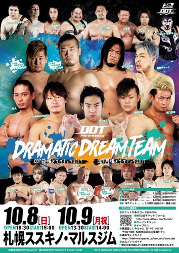 DDTプロレスリング 「DDT日曜どうでしょう2017」 日時:2017年10月8日(日) 19:00 会場:北海道・札幌ススキノ・マルスジム 観衆:416人(満員) 第1試合 第2試合 第3試合 第4試合 セミファイナル メインイベント 第1試合 6人タッグマッチ 30分1本勝負 ○彰人&…