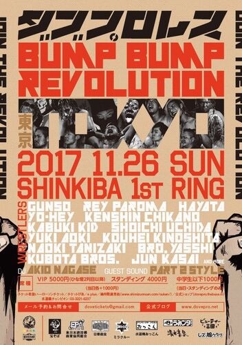 ダブプロレス 「BUMP BUMP REVOLUTION TOKYO」 日時:2017年11月26日(日) 12:30 会場:東京・新木場1stRING 観衆:336人(超満員札止め) 第1試合 第2試合 第3試合 セミファイナル メインイベント 第1試合 6人タッグマッチ 30分1本勝負 ヒデ久保田(フリー)&●…